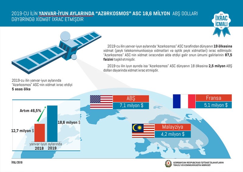 2019-cu ilin iyun ayında isə “Azərkosmos” ASC dünyanın 18 ölkəsinə 2,5 milyon ABŞ dolları dəyərində xidmət ixrac edilib. “Azərkosmos” ASC-nin 2019-cu ilin yanvar-iyun aylarında xidmət ixracı həyata keçirdiyi əsas ölkələr ABŞ, Fransa, Malayziyadır.