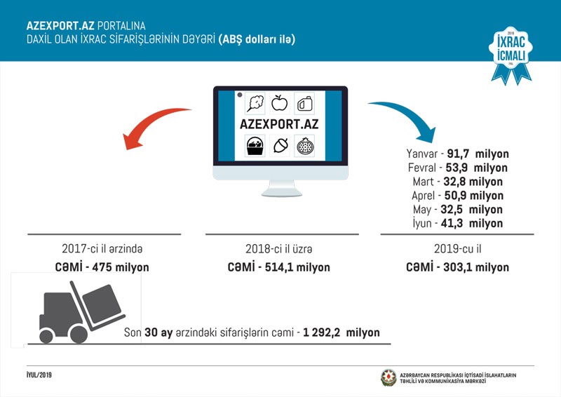 Məlumat üçün qeyd edək ki, 2017-ci ilin yanvar ayından 2019-cu ilin 30 iyun tarixinə kimi (30 ay ərzində) Azexport.az portalına dünyanın 133 ölkəsindən daxil olan ixrac sifarişlərinin dəyəri 1 milyard 292,2 milyon ABŞ dolları təşkil edib.