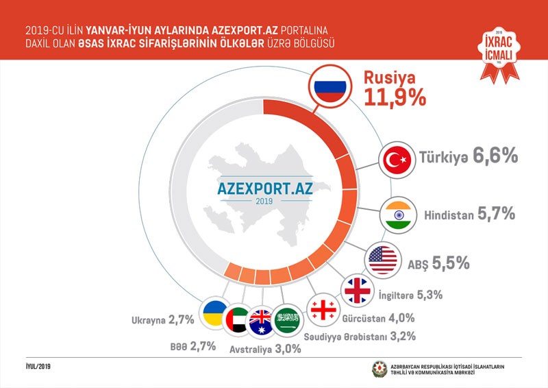 2019-cu ilin birinci yarısında portala daxil olan ixrac sifarişlərinin ilk beşliyində isə Rusiya (11,9%), Türkiyə (6,6%), Hindistan (5,7%), ABŞ (5,5%) və İngiltərə (5,3%) qərarlaşıb.