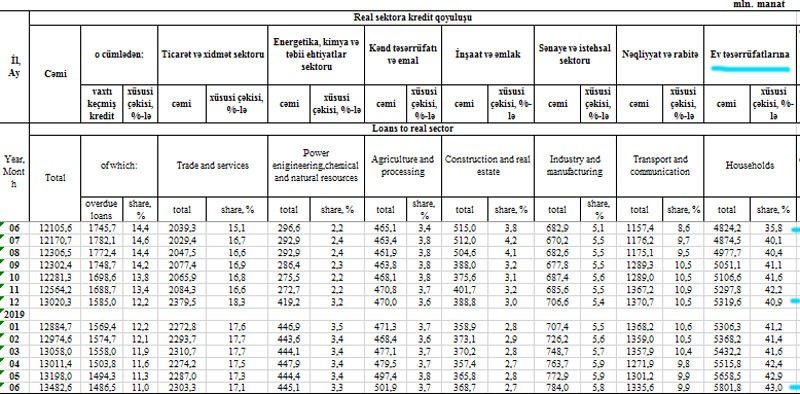 “Marja” Mərkəzi Bankın statistikasına istinadən xəbər verir ki, iyun ayında ev təsərrüfatlarına verilən kreditlər (əsasən istehlak kreditləri) 143,3 milyon manat artaraq 5 milyard 802 milyon manata yüksəlib. Ev təsərrüfatlarına verilən kreditlərin cəmi kredit qoyuluşlarında xüsusi çəkisi 43%-ə çatıb. 2018-ci ilin İyun ayının sonunda bu nisbət 35,8%, 2018-ci ilin sonunda 40,9% təşkil etmişdi.