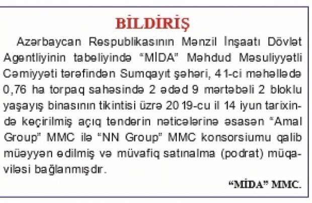 "MİDA" MMC Sumqayıt şəhərində iki yaşayış binasının tikinti işlərinin həyata keçirilməsinə dair açıq tenderin qaliblərini elan edib.