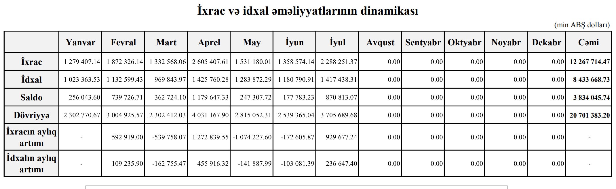 Müqayisə üçün qeyd edək ki, 2018-ci ilin yanvar-iyul dövründə Azərbaycanın xarici ticarət əməliyyatlarının həcmi 16 milyard 524 milyon 541 min dollar, o cümlədən idxal 5 milyard 776 milyon 222 min dollar, ixrac 10 milyard 748 milyon 319 min manat, saldo müsbət 4 milyard 2 milyon manat təşkil etmişdi.