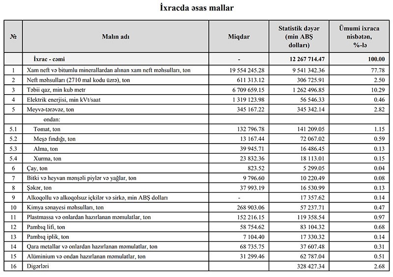 Dövlət Gömrük Komitəsinin aylıq hesabatına görə, bu həcmdə məhsulun dəyəri 9 milyard 541 milyon 342 min ABŞ dolları təşkil edib.