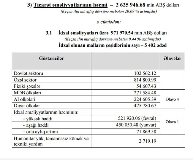 Fevralda ixrac 849 milyon 352.07 min dollar, idxal 521 milyon 920.06 min dollar, saldo (ticarət profisiti) isə 327 milyon 432 min dollar təşkil edib.