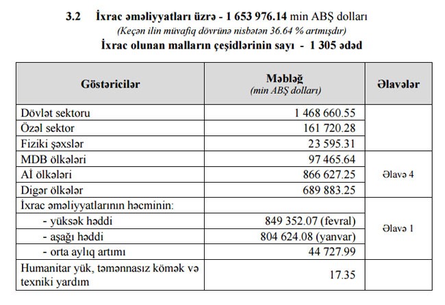 Ötən ilin anoloji dövrü ilə müqayisədə dövlət sektorunun ixracı 37,6%, özəl sektorun ixracı 15,3%, fiziki şəxslərin ixraı 45% artıb.