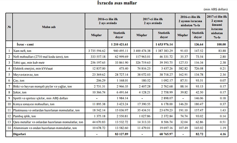 2016-cı ilin yanvar-fevral aylarında dövlət sektorunun ixracı 1 milyard 66 milyon 935 min dollar, özəl sektorun ixracı 140 milyon 248 min dollar, fiziki şəxslərin ixracı 16 milyon 285 min dollar təşkil etmişdi.