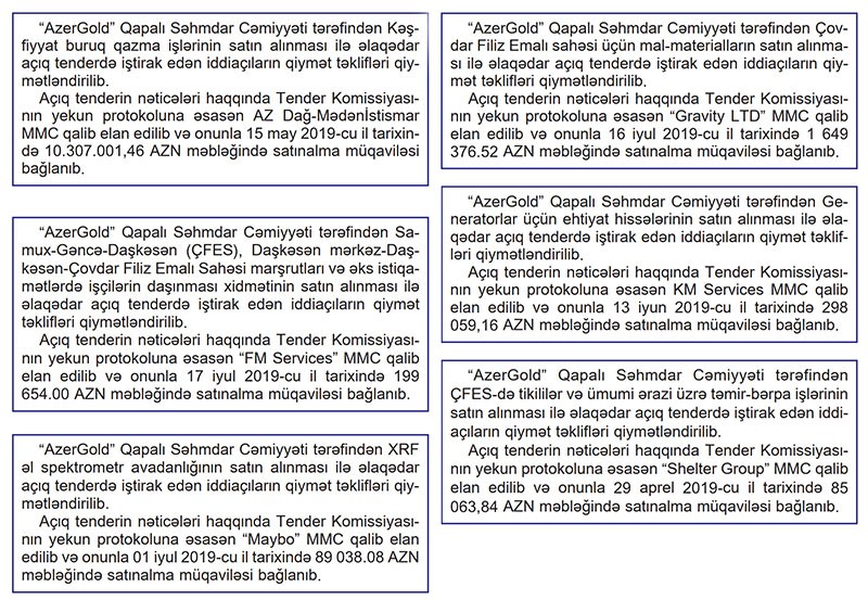 Aprel-İyun aylarında “AzərGold" tərəfindən 13 milyon 450 min manat məbləğində 6 müqavilə imzalanıb. Ən böyük məbləğli müqavilə “AZ Dağ-Mədənİstismar” MMC ilə bağlanıb. “AzərGold” 10 milyon 307 min manata kəşfiyyat buruq qazma işlərini satın alıb.