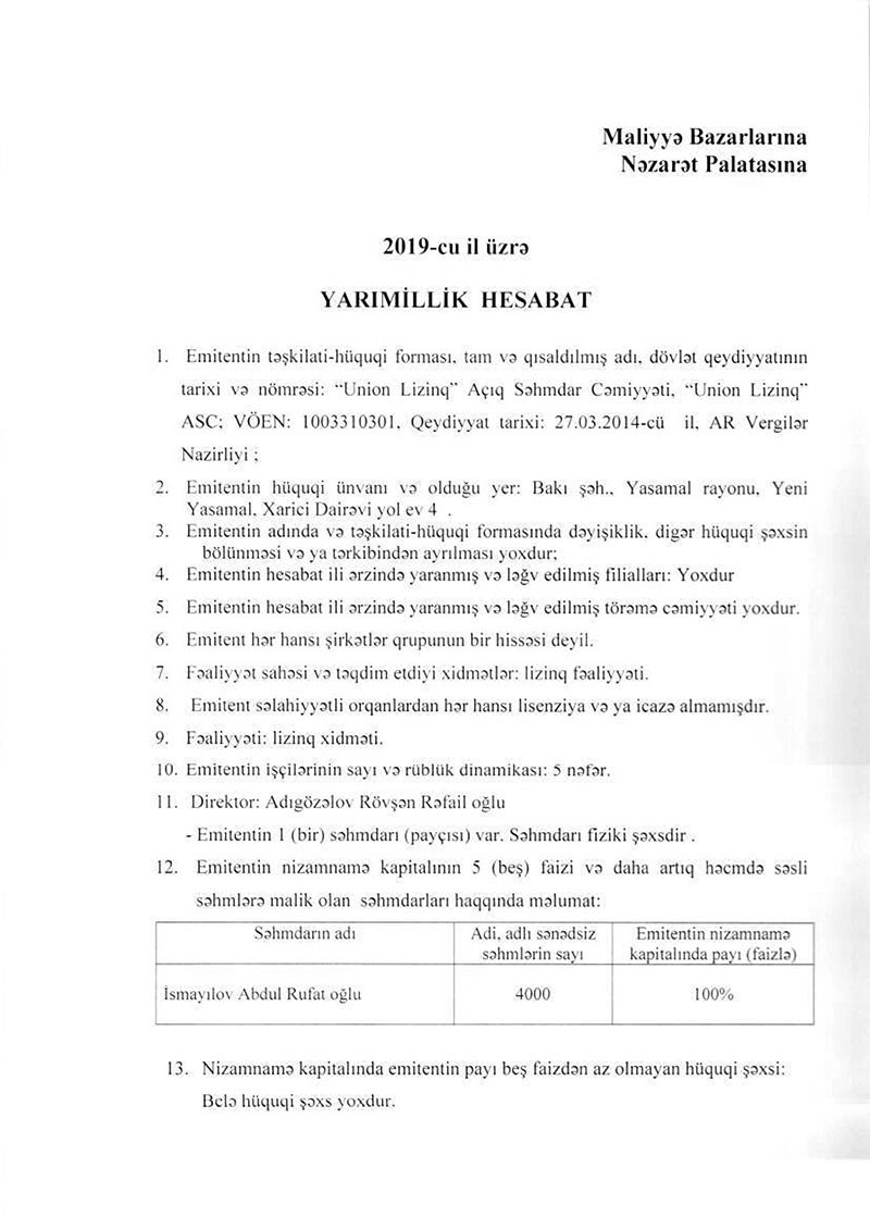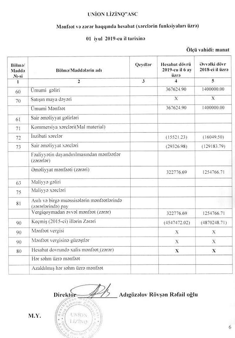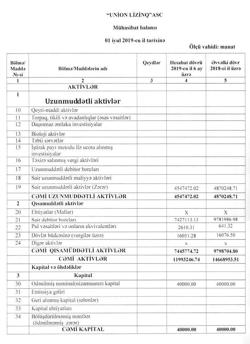 30 İyun 2019-cu il tarxində “Union Lizinq” 4 milyon 547 min manat yığılmış zərərə malik olub.