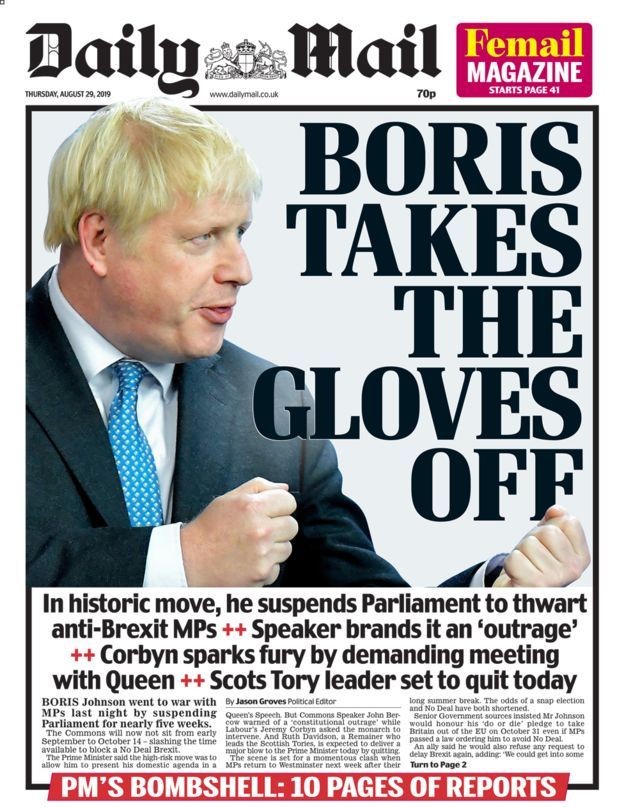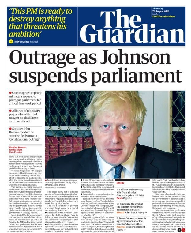 "Brexit" əleyhinə mövqeyilə tanınan "Guardian" qəzeti "Consonun parlamenti təxirə salmasına üsyan" başlığını verib. Ölkənin ən yüksək tirajlı qəzeti "Brexit" tərəfdarı "Daily Mail" isə "Conson əlcəkləri atıb" başlığını manşetə çıxarıb.