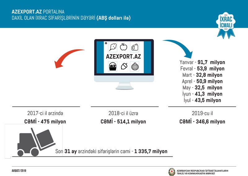 Məlumat üçün qeyd edək ki, 2017-ci ilin yanvar ayından 2019-cu ilin 31 iyul tarixinə kimi (31 ay ərzində) Azexport.az portalına dünyanın 133 ölkəsindən daxil olan ixrac sifarişlərinin dəyəri 1 milyard 336 milyon ABŞ dolları təşkil edib.