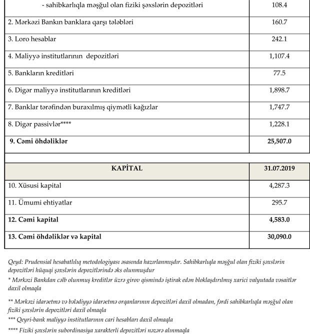 31 iyul 2019-cu il tarixinə bank sektorunun əsas göstəriciləri bank sektorunun icmal göstəricilərində öz əksini tapıb.