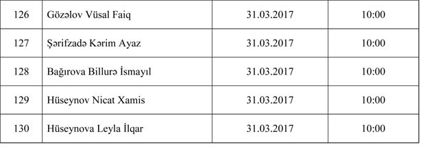 Palatandan "Marja"ya daxil olmuş məlumata görə, namizədlər, 27 mart 2017-ci il tarixindən 31 mart 2017-ci il tarixinədək davam edəcək attestasiyanın yenilənmiş tarixi və vaxtı barədə məlumatı aşağıdakı siyahıdan əldə edə bilərlər.