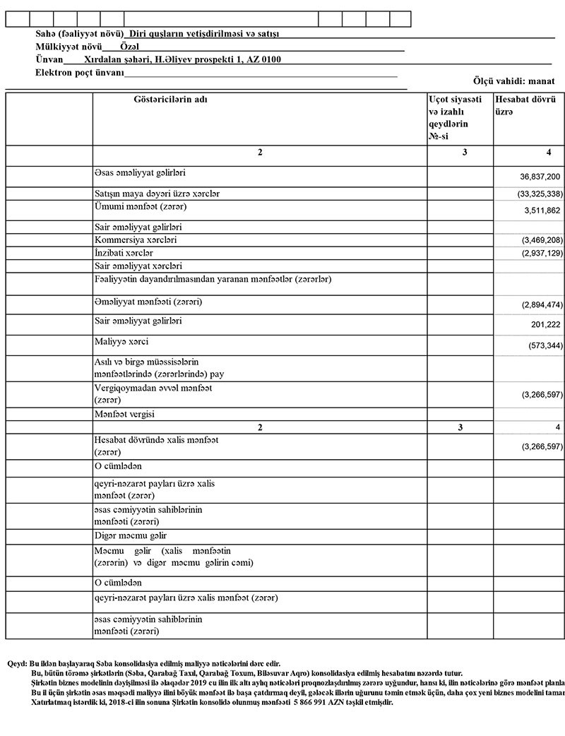 "Bu, bütün törəmə şirkətlərin ("SƏBA", "Qarabağ Taxıl", "Qarabağ Toxum", "Biləsuvar Aqro") konsolidasiya edilmiş hesabatını nəzərdə tutur. Şirkətin biznes modelinin dəyişilməsi ilə əlaqədər 2019-cu ilin ilk altı aylıq nəticələri proqnozlaşdırılmış zərərə uyğundur, hansı ki, ilin nəticələrinə görə mənfəət planlaşdırılır. Bu il üçün şirkətin əsas məqsədi maliyyə ilini böyük mənfəət ilə başa çatdırmaq deyil, gələcək illərin uğurunu təmin etmək üçün, daha çox yeni biznes modelini tamamlamaqdır. Xatırlatmaq istərdik ki, 2018-ci ilin sonuna şirkətin konsolidə olunmuş mənfəəti 5 milyon 866 min 991 manat təşkil edib".