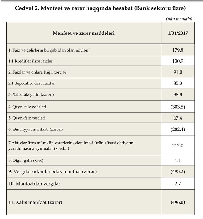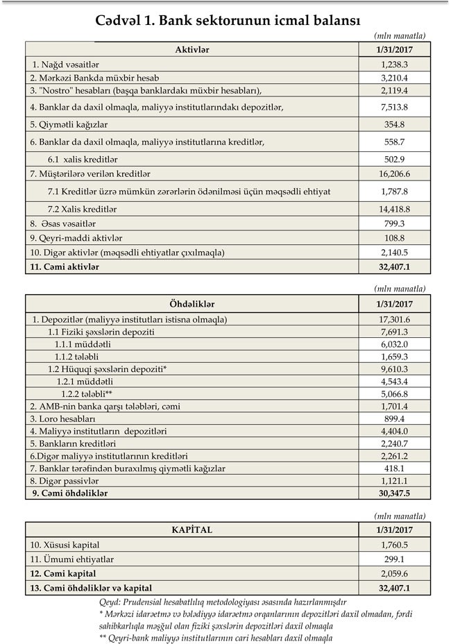 2017-ci ilin 31 yanvar tarixinə olan bank sektorunun əsas göstəriciləri bank sektorunun icmal göstəricilərində öz əksini tapmışdır.