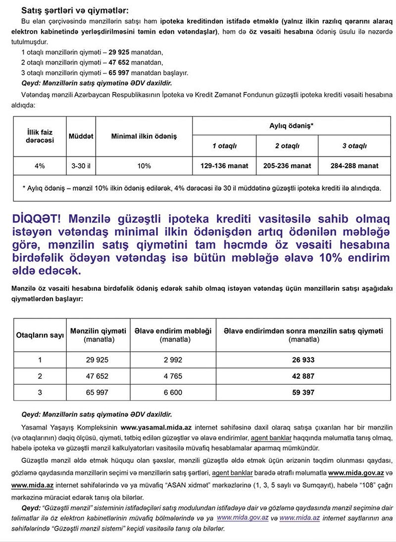 Azərbaycan Respublikası Mənzil İnşaatı Dövlət Agentliyinin ilk layihəsi - Yasamal Yaşayış Kompleksində mənzillərin güzəştlə satışı barədə ELAN