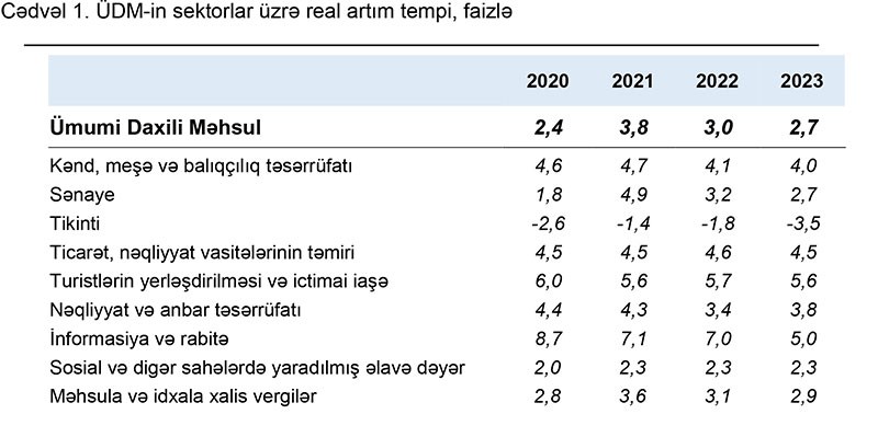 Proqnoza əsasən ölkədə ÜDM ortamüddətli dövrdə orta hesabla 3,0 faiz real artımla 2023-cü ildə 96,9 milyard manata qədər artacaqdır. Qeyd edək ki, ÜDM deflyatoru növbəti iki ildə 3,0 faizə qədər artsa da, 2022-23-cü illərdə 1,8 faiz səviyyəsində qərarlaşacaqdır.