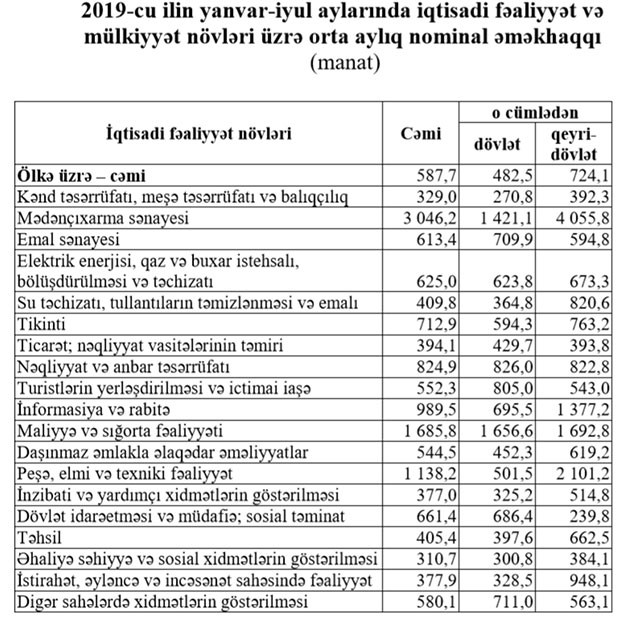 2019-cu ilin yanvar-iyul aylarında ölkə iqtisadiyyatında muzdla çalışan işçilərin orta aylıq nominal əməkhaqqı 2018-ci ilin müvafiq dövrünə nisbətən 8,4 faiz artaraq 587,7 manat təşkil etmişdir.
