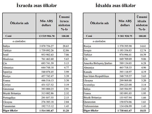 Azərbaycana ən çox mal göndərən 2-ci ölkə Türkiyə (974 milyon 996 min dollar), 3-cü ölkə isə Çindir (849 milyon 709 min dollar).