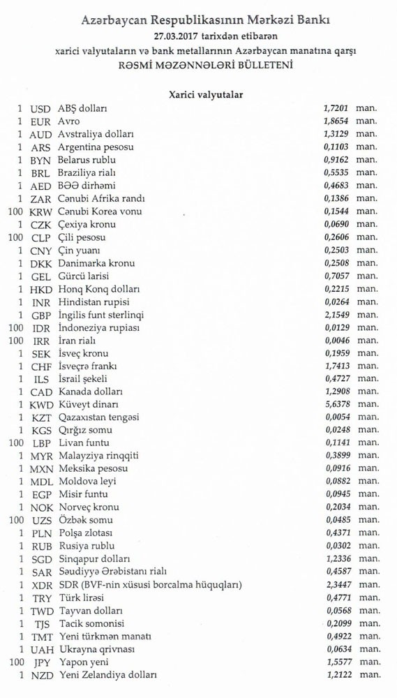 Martın 27-nə Mərkəzi Bankın açıqladığı rəsmi Dollar/manat məzənnəsi Martın 17-i ilə müqayisədə düşərək 1,7201 manat olub, Avro/manat məzənnəsi isə 1.8654 manata qalxıb.
