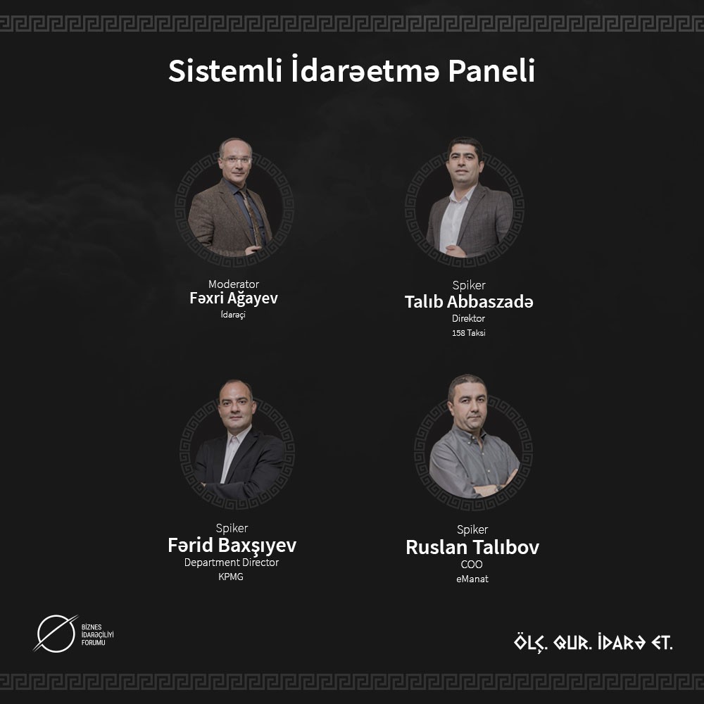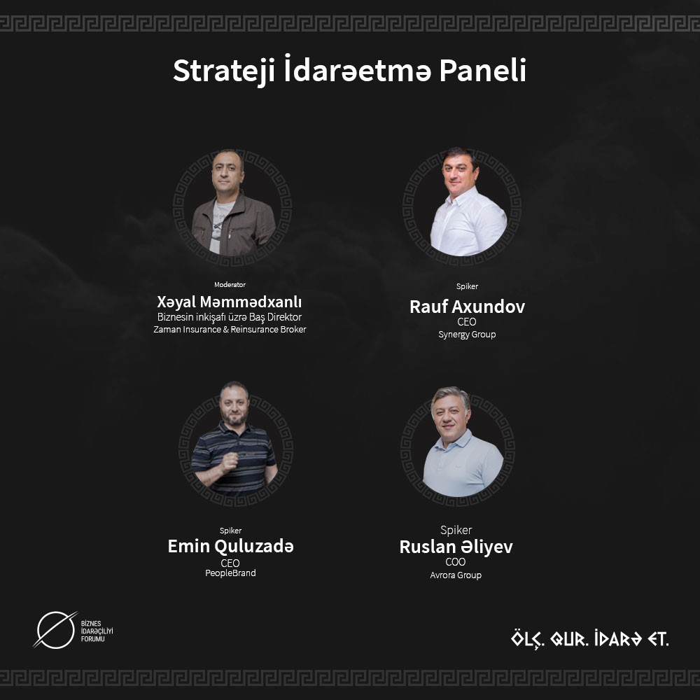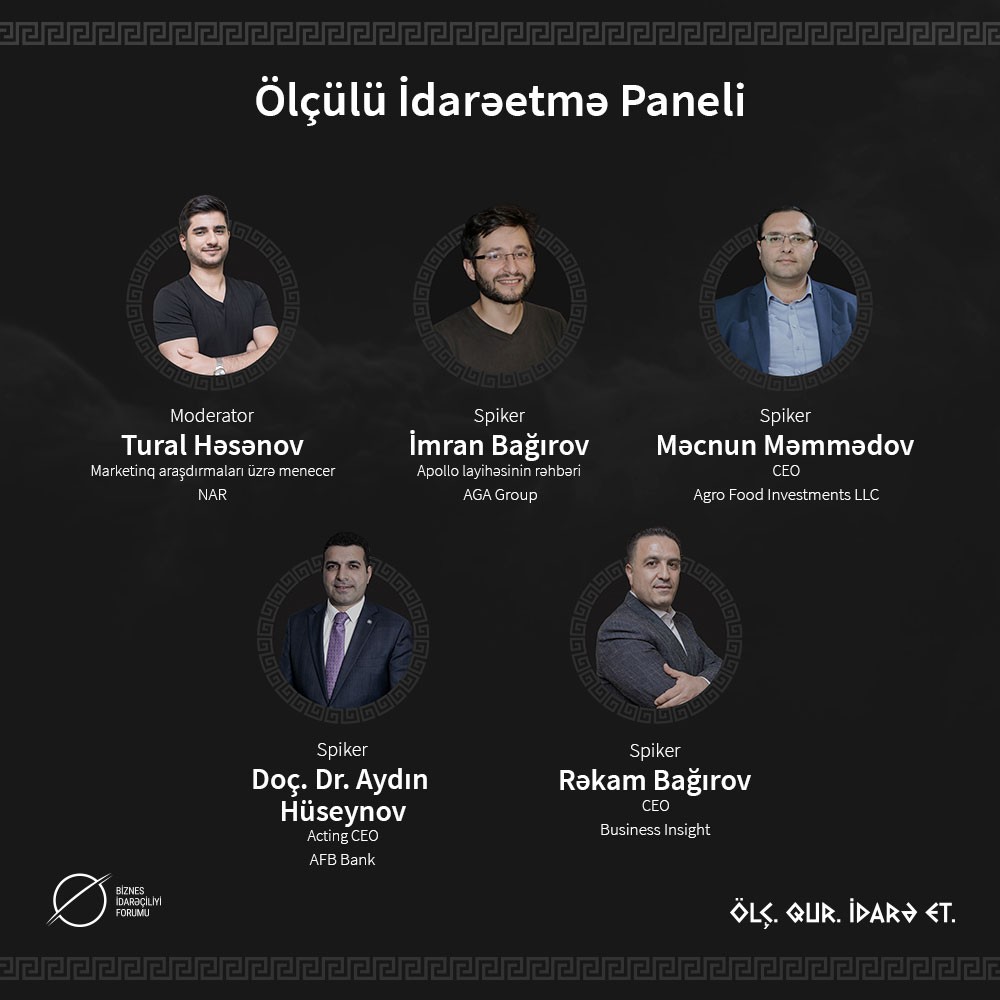 Biznes İdarəçiliyi Forumu Strateji idarəetmə; Sistemli idarəetmə və Ölçülü idarəetmə üzrə 3 paneldən ibarət olacaq. Hər paneldə 1 moderator və 3 spiker olmaqla toplamda 13 nəfər mütəxəssis çıxış edəcək: İmran Bağırov (Aga Group – Apollon layihəsinin rəhbəri), Məcnun Məmmədov (Agro Food Investments LLC - CEO), Tural Həsənov (Nar - Marketinq araşdırmaları şöbəsinin rəhbəri), Aydın Hüseynov (AFB Bank – İdarə Heyətinin Sədri V.İ.E.), Rəkam Bağırov (Business Insight - CEO), Fəxri Ağayev (İdarəçi), Fərid Baxşıyev (KPMG – Departament Direktor), Talıb Abbaszadə (158 TAXİ – CEO), Ruslan Talıbov (eManat - CEO), Xəyal Məmmədxanlı (Zaman Insurance & Reinsurance Broker - Biznesin inkişafı üzrə Baş Direktor), Rauf Axundov (Synergy Group - CEO), Ruslan Əliyev (Avrora Group – İstehsalat müdürü), Emin Quluzadə (PeopleBrand - CEO).