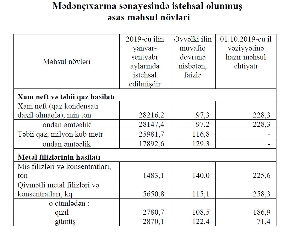 2019-cu ilin yanvar-sentyabr aylarında mədənçıxarma sənayesində istehsalın ümumi dəyəri 24,2 milyard manat olmaqla, əvvəlki ilin yanvar-sentyabr aylarına nisbətən 0,1 faiz artıb.