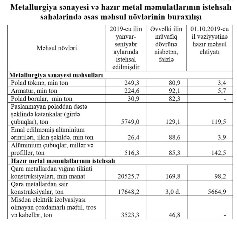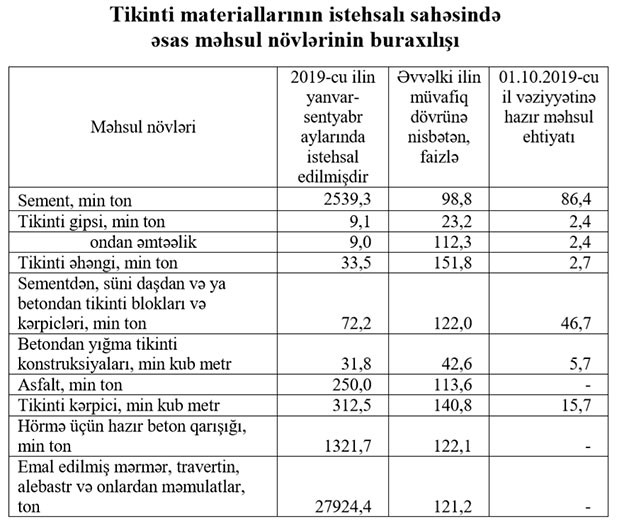 Ümumən, 2019-cu ilin yanvar-sentyabr aylarında tikinti materiallarının istehsalı sahəsində fəaliyyət göstərən müəssisələr tərəfindən istehsal edilmiş məhsulun ümumi dəyəri 4,2 faiz artaraq 580,5 milyon manat təşkil edib. Tikinti kərpicinin istehsalı 40,8 faiz, tikinti əhənginin istehsalı 51,8 faiz, hörmə üçün hazır beton qarışığının istehsalı 22,1 faiz artıb, sementin istehsalı 1,2 faiz, betondan yığma tikinti konstruksiyalarının istehsalı 57,4 faiz, tikinti gipsinin istehsalı 76,8 faiz azalıb.