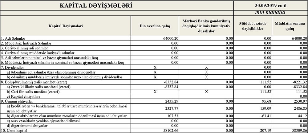 Qısası, 2019-cu ilin 9 ayında “NBC Bank”ın 17 milyon 18 min manat cəmi gəlirlərinə qarşılıq cəmi xərcləri 17 milyon 924 min manat təşkil edib. Xərclər gəlirləri üstələdiyindən 906 min manat əməliyyat zərəri yaranıb. Lakin əvvəlki dövrlərdə ehtimal olunan kredit və depozit itkiləri üçün yaradılmış ehtiyatdan 1 milyon 17 min manatın azad olması həm əməliyyat zərərini bağlayıb, həm də 111 min manat xalis mənfəətin yaranmasını təmin edib.