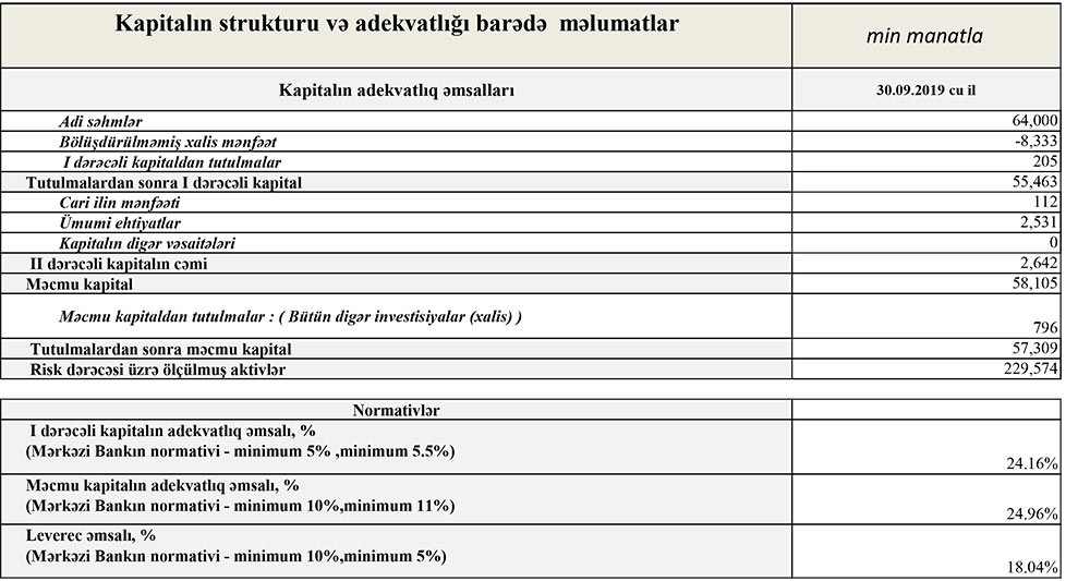 30 Sentyabr 2019-cu il tarixində “NBC Bank” 58 milyon 309 min manat cəmi kapitala, 57 milyon 309 min manat məcmu kapitala malik olub.
