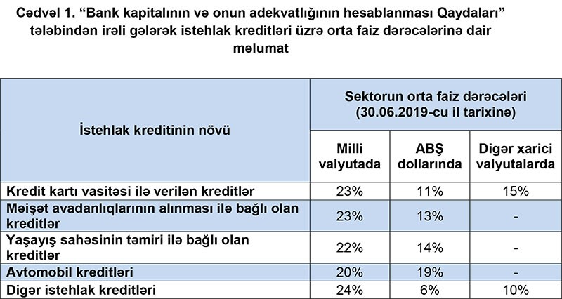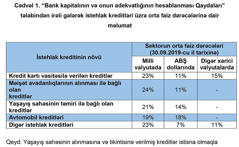 Belə ki, milli valyutada istehlak kreditlərindən, orta faiz dərəcəsi Kredit kartı vasitəsi ilə verilən kreditlər üzrə 23%, Məişət avadanlıqlarının alınması ilə bağlı olan kreditlər üzrə 23%, Yaşayış sahəsinin təmiri ilə bağlı olan kreditlər üzrə 22%, avtomobil kreditləri üzrə 20%, Digər istehlak kreditləri üzrə 24% təşkil edib.