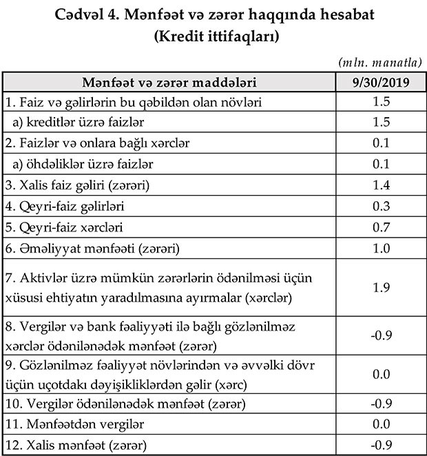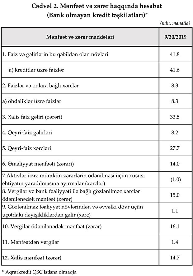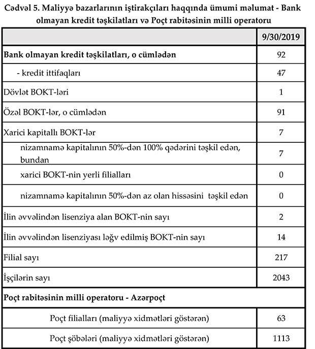 Maliyyə Bazarlarına Nəzaər Platasının yaydığı press-relizə görə, 30 sentyabr 2019-cu il tarixinə Azərbaycanda fəaliyyət göstərən bank olmayan kredit təşkilatlarının (BOKT) cəmi aktivləri 314,4 mln. manat, cəmi öhdəlikləri isə 188,6 mln. manat təşkil edib. Bundan əlavə Kredit ittifaqlarının (Kİ) 2019-cu ilin III rübündə cəmi aktivləri 15,9 mln. manat, cəmi öhdəlikləri isə 6,1 mln. manat təşkil edib.