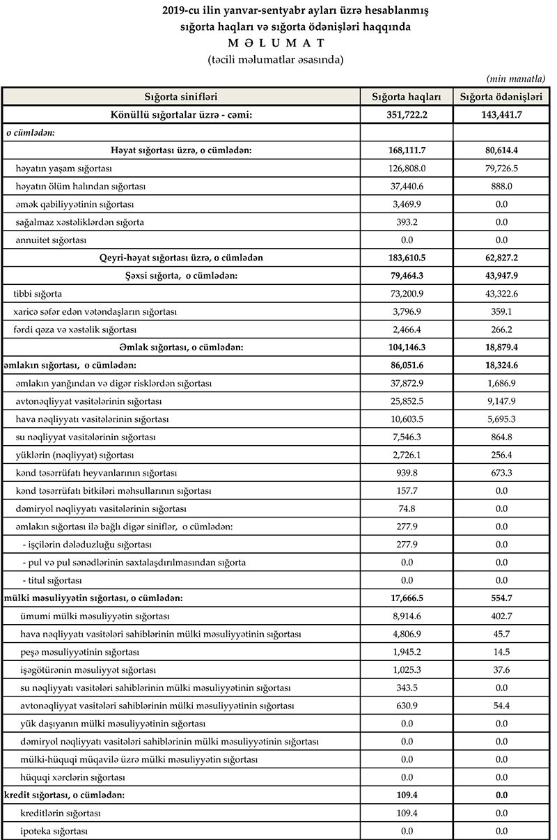 2019-cu ilin yanvar-sentyabr aylarında ölkədə fəaliyyət göstərən sığorta şirkətləri tərəfindən 522.5 mln. manat məbləğində sığorta haqqı toplanıb, 201.7 mln. manat məbləğində sığorta ödənişi həyata keçirilib.