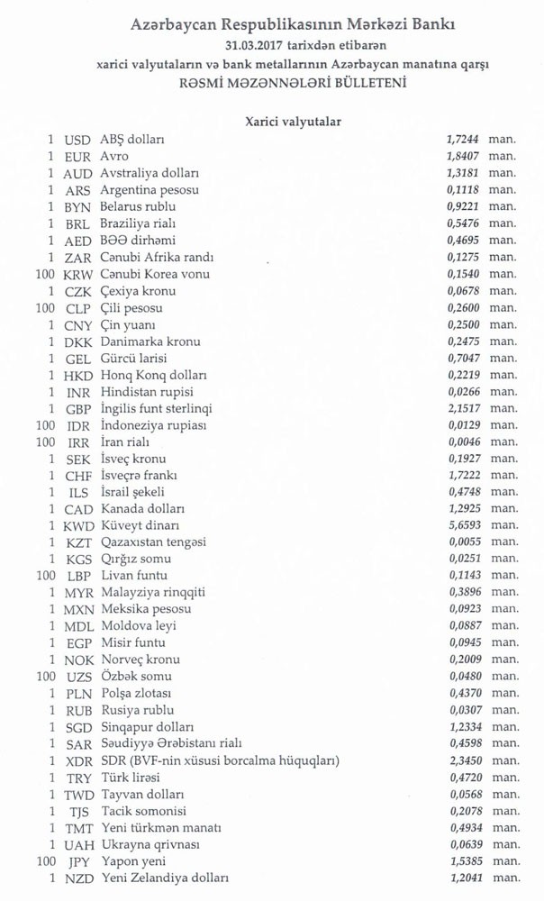 Martın 31-nə Mərkəzi Bankın açıqladığı rəsmi Dollar/manat məzənnəsi Martın 30-u ilə müqayisədə qalxaraq 1,7244 manat olub, Avro/manat məzənnəsi isə 1.8407 manata düşüb .