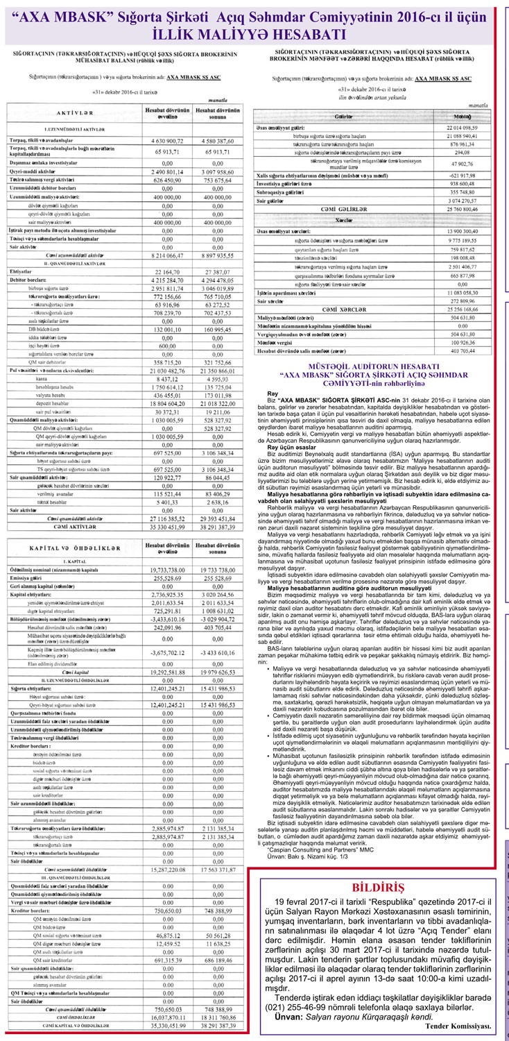 “AXA MBASK” Sığorta Şirkəti ASC 2016-cı ili 403 min 705 manat xalis mənfəət ilə başa vurub. Bu, 2015-ci illə müqayisədə təxminən 67% çoxdur. Belə ki, “AXA MBASK” 2015-ci ilin yekunları üzrə 242 min 91 manat xalis mənfəət açıqlamışdı.