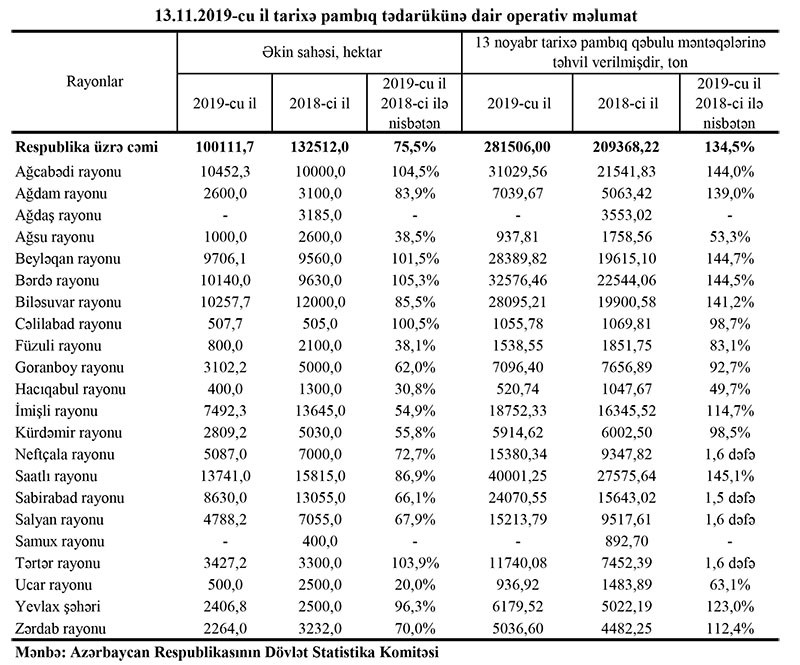 Respublikada pambıq tədarükünə dair noyabrın 13-nə olan operativ məlumatı təqdim edirik.