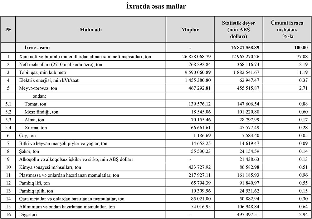 Neft və bitumlu minerallardan alınan xam neft məhsulları ixracının ümumi ixraca nisbəti 80.92%-dən 77.08-ə düşüb.