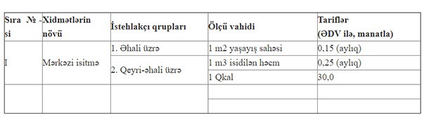 Qeyd edək ki, hazırda əhali qrupu üçün istilik tarifləri 1 kvadratmetr yaşayış sahəsi 0,15 manat (aylıq), qeyri-əhali üçün 1 kubmetr isidilən həcm 0,25 manatdır (aylıq).