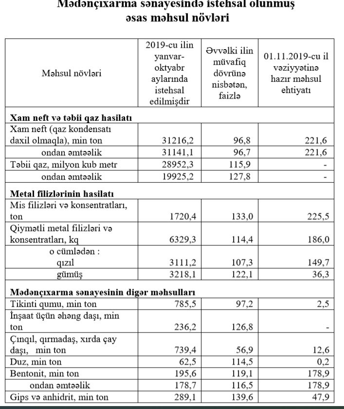 “Marja” Dövlət Statistika Komitəsinin aylıq hesabatına istinadən xəbər verir ki, 2019-cu ilin yanvar - oktyabr aylarında mədənçıxarma sənayesində istehsalın ümumi dəyəri 26,8 milyard manat olmaqla, əvvəlki ilin yanvar-oktyabr aylarına nisbətən sabit qalmışdır.