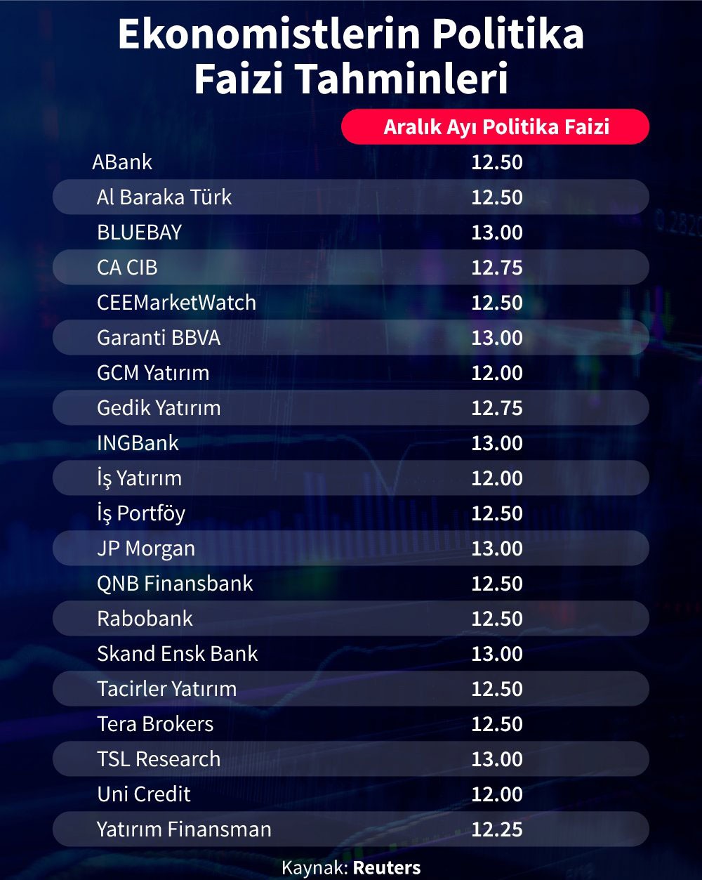 Türkiyə Mərkəzi Bankının əsas pul siyasəti faizi 14% səviyyəsindədir. Faizin ən çox 12,50% və 13% səviyyələrinə endiriləcəyi gözlənilir.