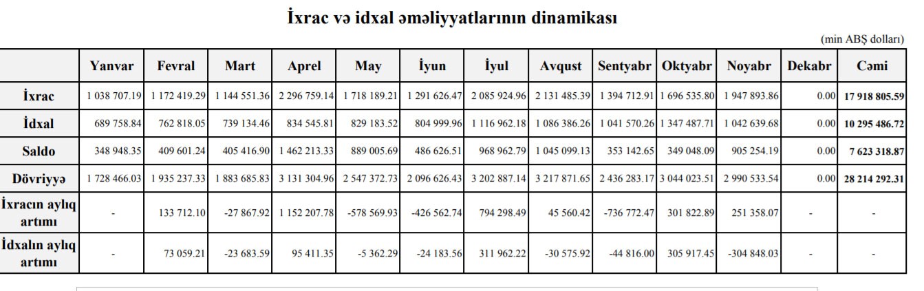 Noyabr ayında ixrac 1 milyard 947 milyon 893 min dollar, idxal 1 milyard 42 milyon 639 min dollar, saldo 905 milyon 254 min dollar təşkil edib.