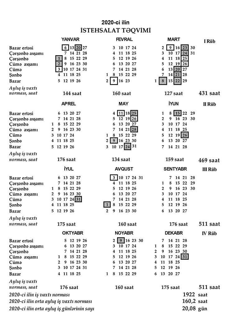 2020-ci ilin iş vaxtı norması 40 saatlıq beşgünlük iş həftəsi üzrə 8 saatlıq iş günü hesabından müəyyən edilir və bu zaman Əmək Məcəlləsinin 108-ci maddəsinin 1-ci hissəsinə müvafiq olaraq iş günü hesab edilməyən bayramqabağı, səsvermə, habelə Ümumxalq Hüzn günü qabağı iş günlərində həftəlik iş günlərinin müddəti bir saat qısaldılır.