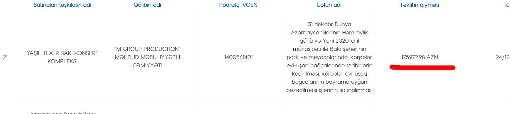 Müqavilə "31 dekabr Dünya Azərbaycanlılarının Həmrəylik günü və Yeni 2020-ci il münasibəti ilə Bakı şəhərinin park və meydanlarında, körpələr evi-uşaq bağçalarında tədbirlərin keçirilməsi, körpələr evi-uşaq bağçalarının bayrama uyğun bəzədilməsi işlərinin satınalınması"nı nəzərdə tutur.