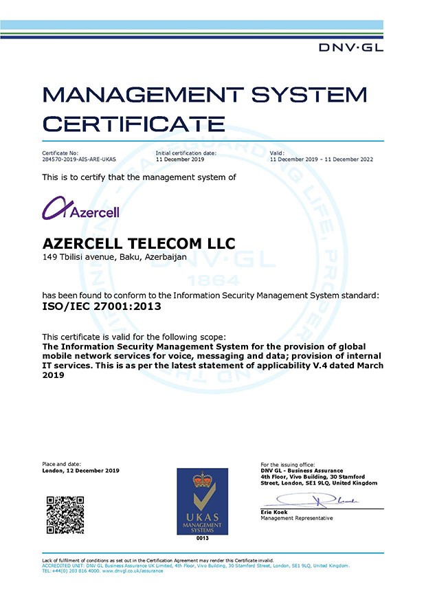 Ölkənin rəqəmsal həllər təqdim edən lider mobil operatoru “Azercell Telekom” MMC bu ili növbəti uğura imza ataraq başa vurur. Bu dəfə Azercell dünya üzrə yüzdən artıq ölkədə sertifikasiya xidmətləri göstərən Norveçin DNV GL şirkəti tərəfindən İSO/IEC 27001 sertifikatına layiq görülüb. Fəaliyyətində şəffaflığın qorunub saxlanmasını, müştəri məlumatlarının təhlükəsizliyini və məxfiliyini təmin etməyi prioritet hesab edərək, Azercell ölkədə bu sertifikata layiq görülən ilk mobil operator oldu. Belə ki, müstəqil audit yoxlamaları zamanı məlumatların təhlükəsizliyini təmin etmək məqsədilə Azercell-in tətbiq etdiyi İnformasiya Təhlükəsizliyi İdarəetmə Sisteminin beynəlxalq standartlara cavab verdiyi təsdiq edilib. İSO/IEC 27001 sertifikatı Azercell-də məlumatların məxfiliyinin, bütövlüyünün və əlçatanlığının yüksək səviyyədə qorunmasını bir daha sübut edir.