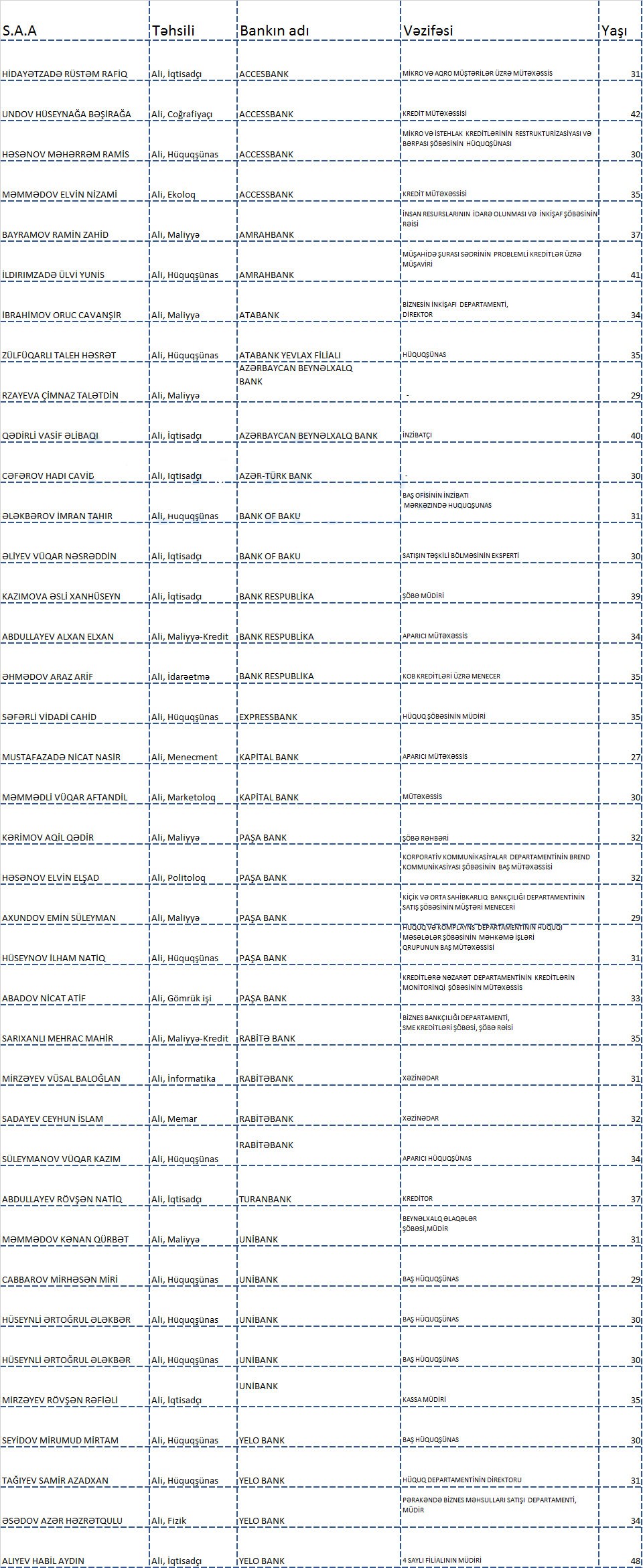 Həmin siyahıda isə diqqəti cəlb edən bank sektorunun əməkdaşları var ki, onların əksəriyyəti ixtisasca hüquqşünasdır. Bu da bəlkə onların qanunvericiliyi daha yaxşı bilməsindən irəli gəlir.