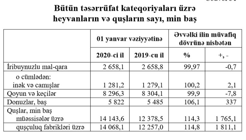 “Marja” Dövlət Statistika Komitəsinin aylıq hesabatına istinadən xəbər verir ki, 2019-cu ilin əvvəli ilə müqayisədə quşların sayı 1 milyon 811 min baş və ya 14,8% artıb.