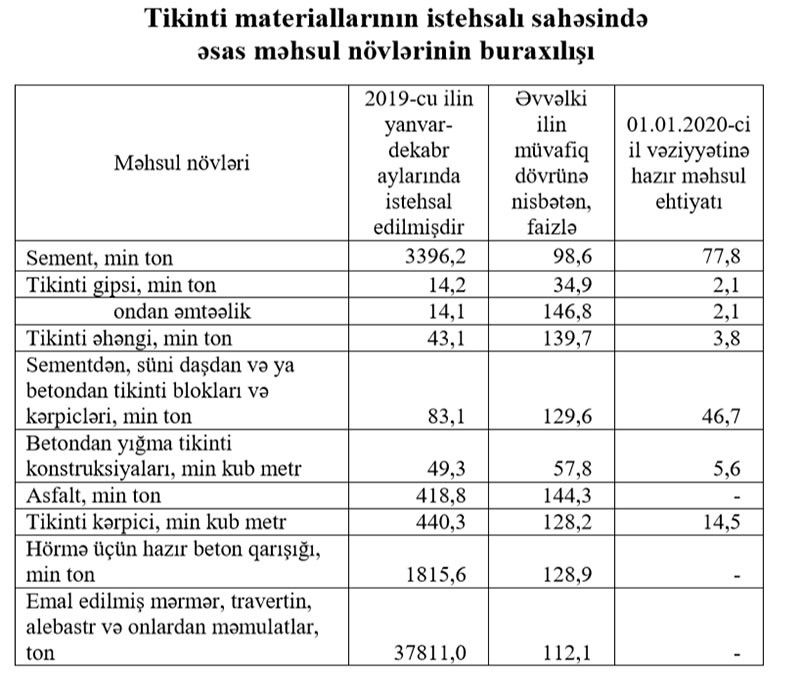 Hesabatda qeyd edilib ki, tikinti materiallarının istehsalı sahəsində fəaliyyət göstərən müəssisələr tərəfindən istehsal edilmiş məhsulun ümumi dəyəri 5 faiz artaraq 771,7 milyon manat təşkil etmişdir. Tikinti əhənginin istehsalı 39,7 faiz, hörmə üçün hazır beton qarışığının istehsalı 28,9 faiz, tikinti kərpicinin istehsalı 28,2 faiz artmış, betondan yığma tikinti konstruksiyalarının istehsalı 42,2 faiz, tikinti gipsinin istehsalı 65,1 faiz azalmışdır.