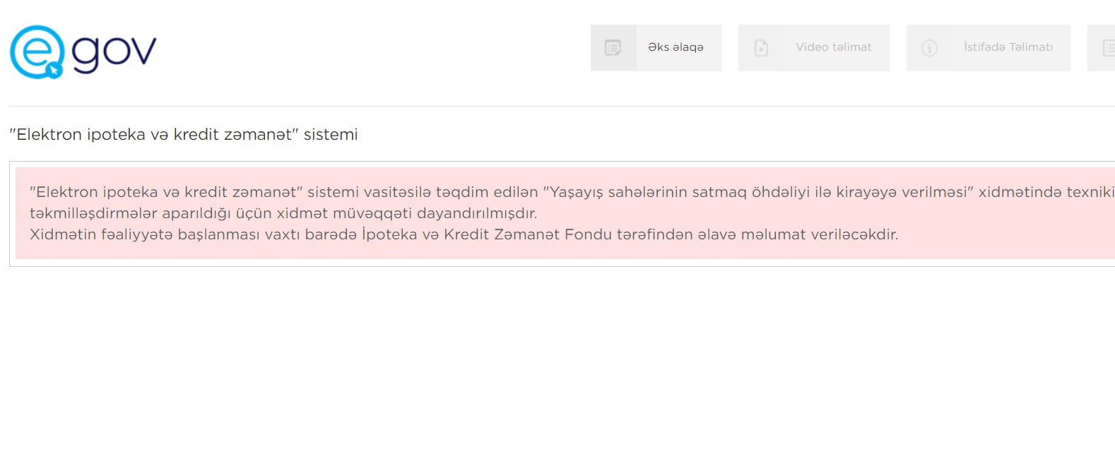 "Elektron ipoteka və kredit zəmanət" sistemi vasitəsilə təqdim edilən "Yaşayış sahələrinin satmaq öhdəliyi ilə kirayəyə verilməsi" xidmətində texniki təkmilləşdirmələr aparıldığı üçün xidmət müvəqqəti dayandırılmışdır. Xidmətin fəaliyyətə başlanması vaxtı barədə İpoteka və Kredit Zəmanət Fondu tərəfindən əlavə məlumat veriləcəkdir".