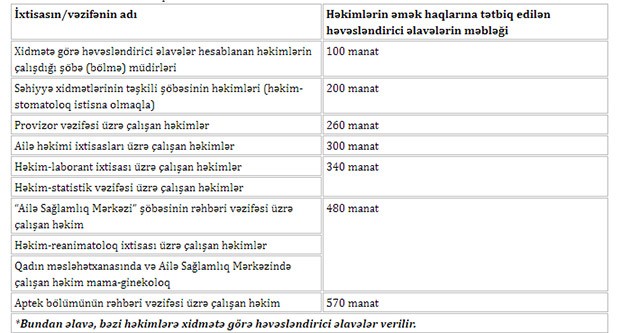 Kənd və qəsəbələrdə yaşayış yerindən uzaq məsafədə çalışan və sabit həvəsləndirici əlavələr ödənilən həkimlərə eyni zamanda sabit əlavələr də ödənilir.