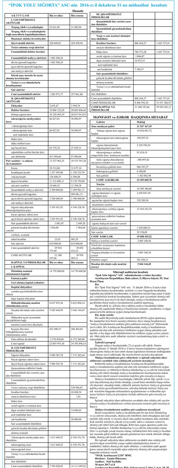 “İpək Yolu Sığorta” ASC 2016-cı ili 3 milyon 44 min manat xalis mənfəət ilə başa vurub. Bu, 2015-ci illə müqayisədə təxminən 50% çoxdur. “İpək Yolu Sığorta” 2015-ci ildə 2 milyon 30 min manat xalis mənfəət açıqlamışdı.