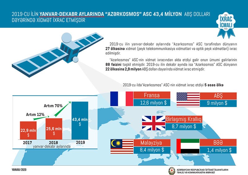2019-cu ilin dekabr ayında isə “Azərkosmos” ASC dünyanın 22 ölkəsinə 2,9 milyon ABŞ dolları dəyəri xidmət ixrac edib. 2018-ci illə müqayisədə 2019-cu ildə “Azərkosmos” ASC-nin xidmət ixracı 70 faiz artıb.