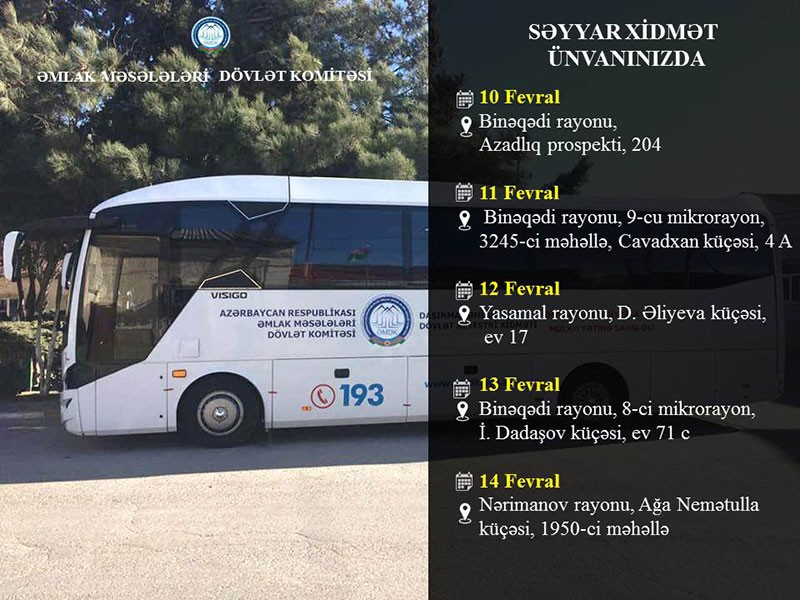 Mobil qeydiyyat ofisi Binəqədi rayonu üzrə fevralın 10-da Azadlıq prospekti, 204, 11 fevralda isə 9-cu mikrorayon, 3245-ci məhəllə, Cavadxan küçəsi, 4 A ünvanlarında mənzil sahiblərinin xidmətində olacaq. Kampaniya 12 fevralda Yasamal rayonu, D.Əliyeva küçəsi, ev 17 ünvanında, 13 fevralda Binəqədi rayonu, 8-ci mikrorayon İ.Dadaşov küçəsi, ev 71 c, 14 fevralda isə Nərimanov rayonu, Ağa Neymətulla küçəsi, 1950-ci məhəllə ünvanlarında davam edəcək.